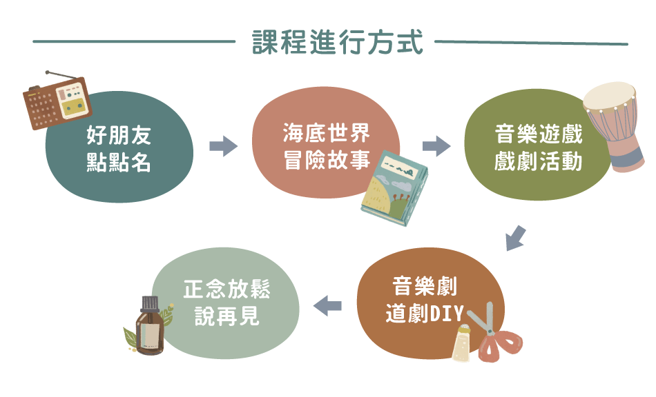 準備好一起潛入繽紛的海底世界了嗎?將經典人魚公主故事改編成孩子的第一場音樂冒險。從風鈴、奶粉罐鼓到人魚尾鰭,透過歌唱、律動與角色扮演,孩子將一步步進入情境,在每週故事中唱出節奏、演出情感、建立表達自信!