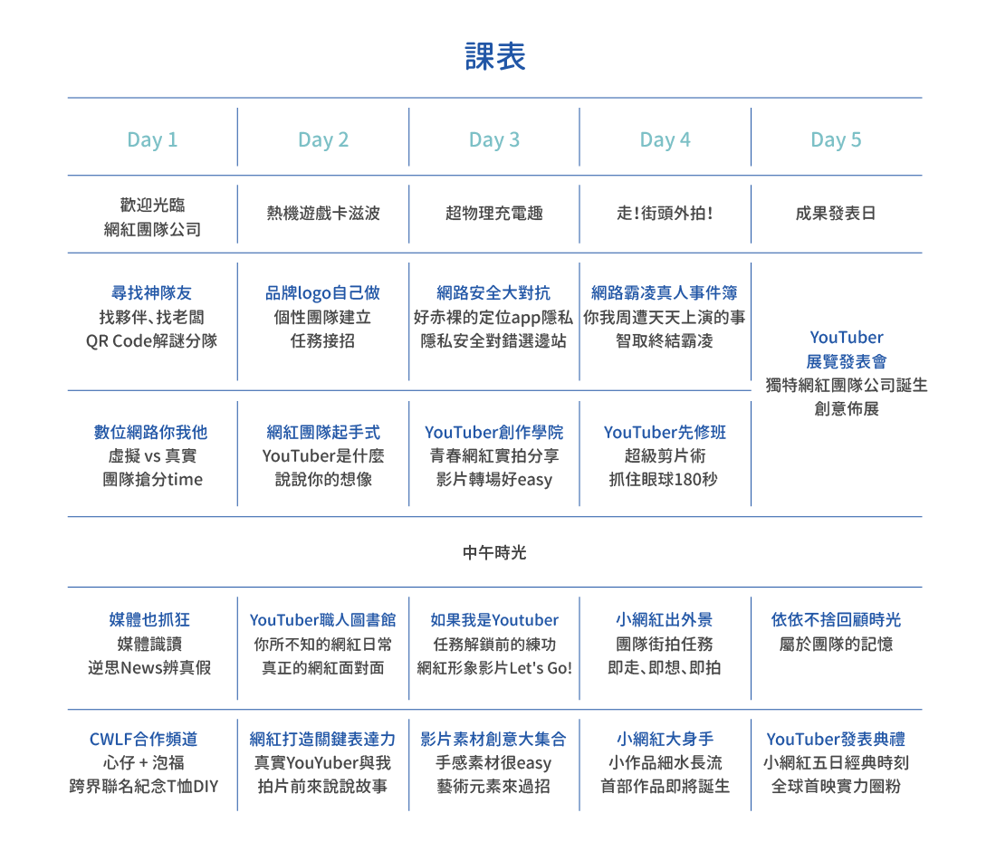 在YouTube擁有近逼70萬訂閱人次的「瘋狂老爹」將親臨營隊現場與孩子們面對面! 除了分享如何將自身的興趣轉換為網路創作者、成為知名紅人,也給未來想經營頻道、 成為網紅的孩子們,打開自我品牌打造的視野,讓孩子發現光鮮亮麗「網紅」背後的頻道經營甘苦談!