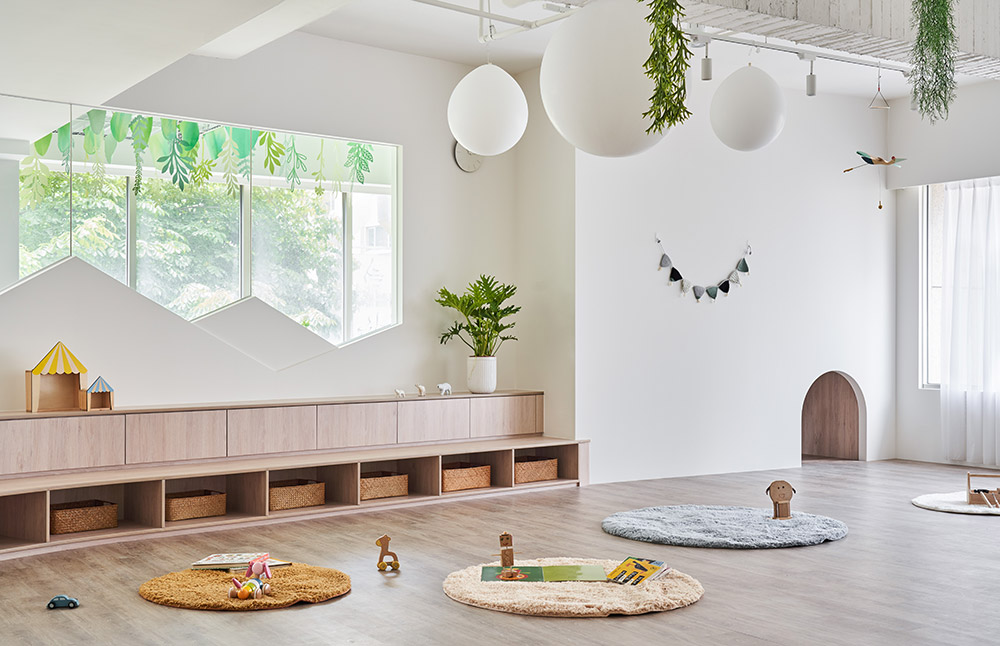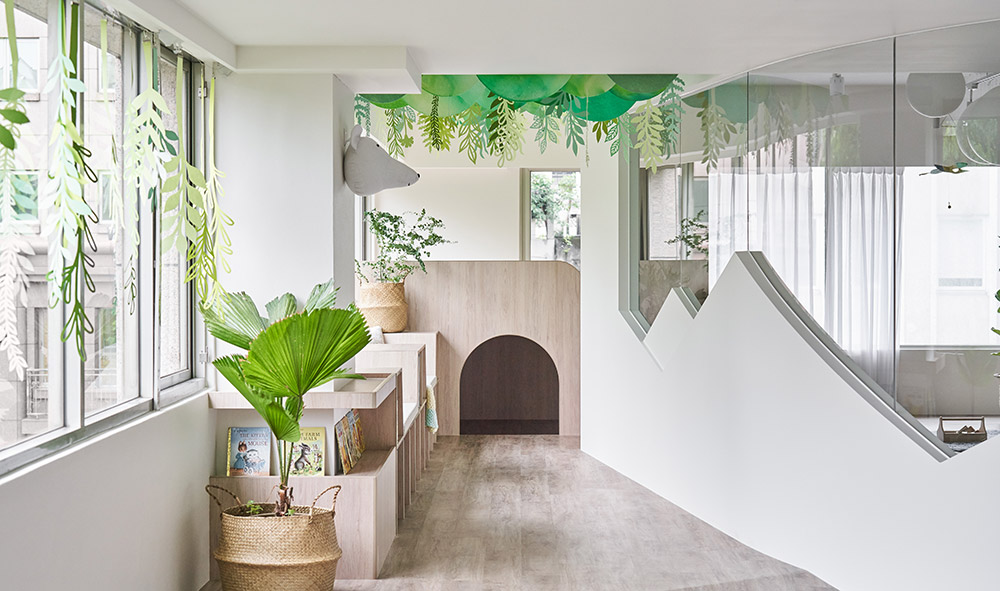 提供舒適的臥榻,親子在課堂開始前,可以在此稍微用餐、一起親子共讀,課程期間家長也可放心偶而離開幼兒教室,透過大面玻璃觀看孩子上課狀況,下課後的山洞成為孩子最喜歡的秘密基地。